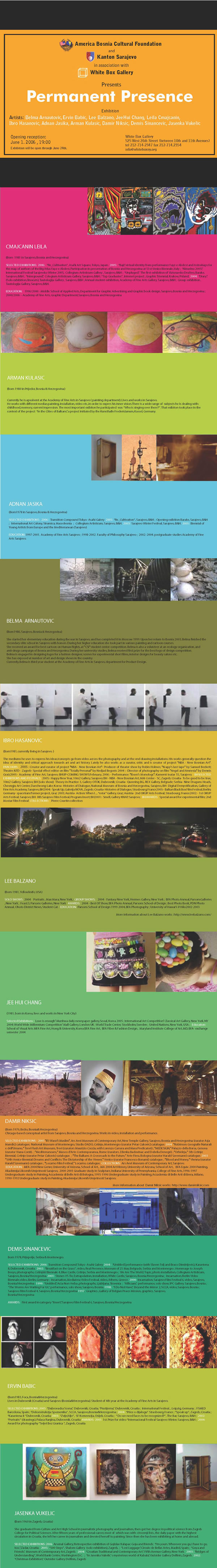 With the work of artists from Bosnia, Herzegovina, and the United States, this exhibition will try and explore the advantages and disadvantages that both societies face in terms of access to knowledge through the usage of language and the exploration of art concepts. Here, the phrase "permanent presence" is meant to acknowledge the "current streams in contemporary art, where confusion and absence of theory are reality.