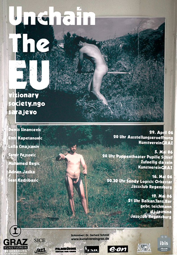 Unchain the EU (European Union) was first VD exhibition out of Bosnia&Herzegovina borders. President and executive director of Kunstverein GRAZ from Regensburg, together with dr. Tanja Wagensohn, find us in our ateliers at Barake. After few very polite words from both sides, Mr. Huber has invited us to have an exhibition in his gallery in Regensburg, Germany. We accepted enthusiastically knowing that it can be great opportunity for us to start international tour after very successful developing and going on of the Barake project.